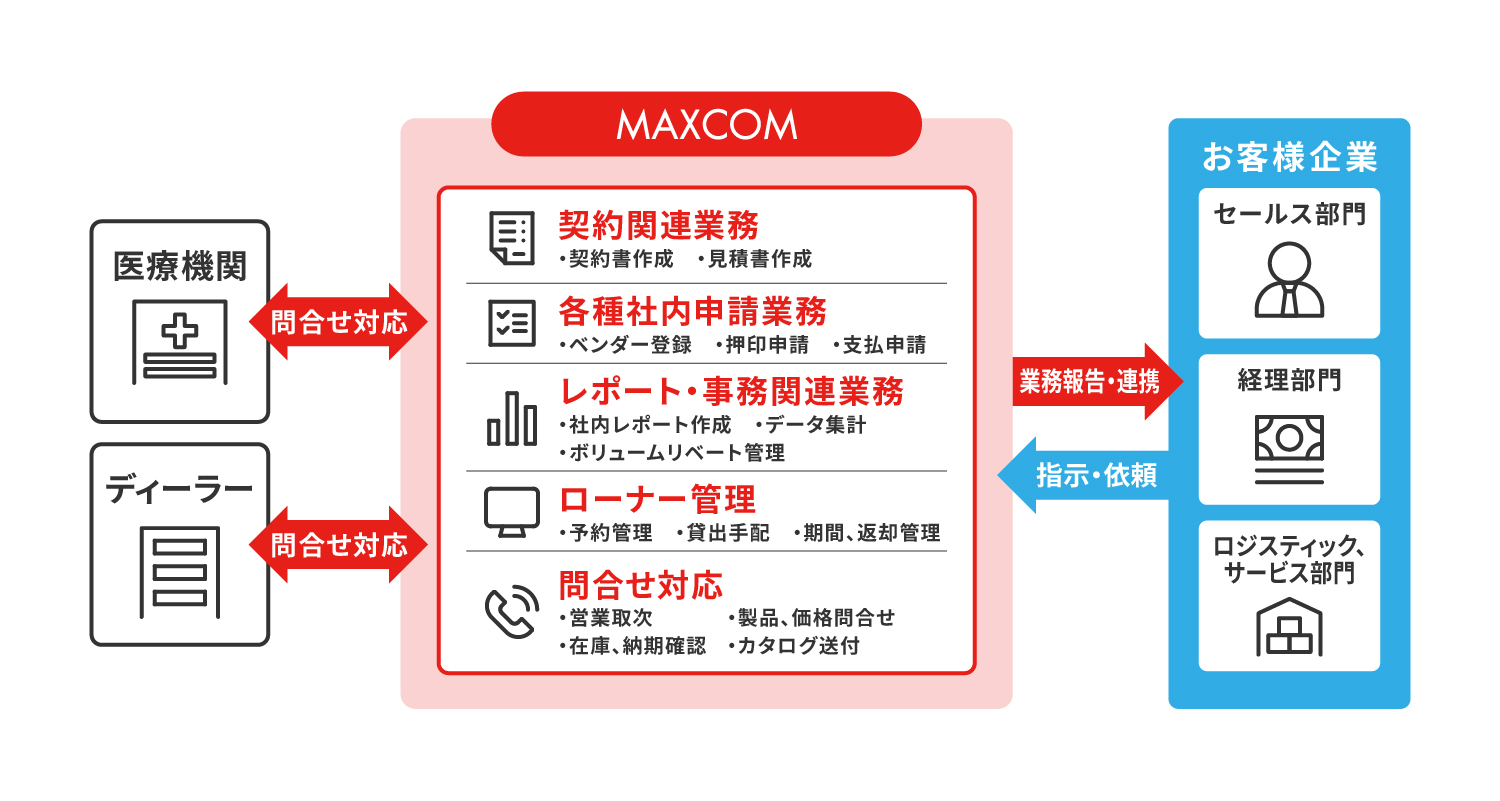 全国の営業拠点で行われていたセールスサポート業務をBPOセンターへ一元化。医療機器業界に精通した専門チームが業務を担当し、品質の均質化を実現 - 申請代行によるプロセスの迅速化