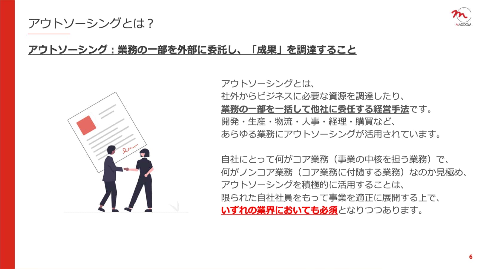 ⾃社にとって何がコア業務(事業の中核を担う業務)で、何がノンコア業務(コア業務に付随する業務)なのか⾒極め、アウトソーシングを積極的に活⽤することは、限られた⾃社社員をもって事業を適正に展開する上で、いずれの業界においても必須となりつつあります。