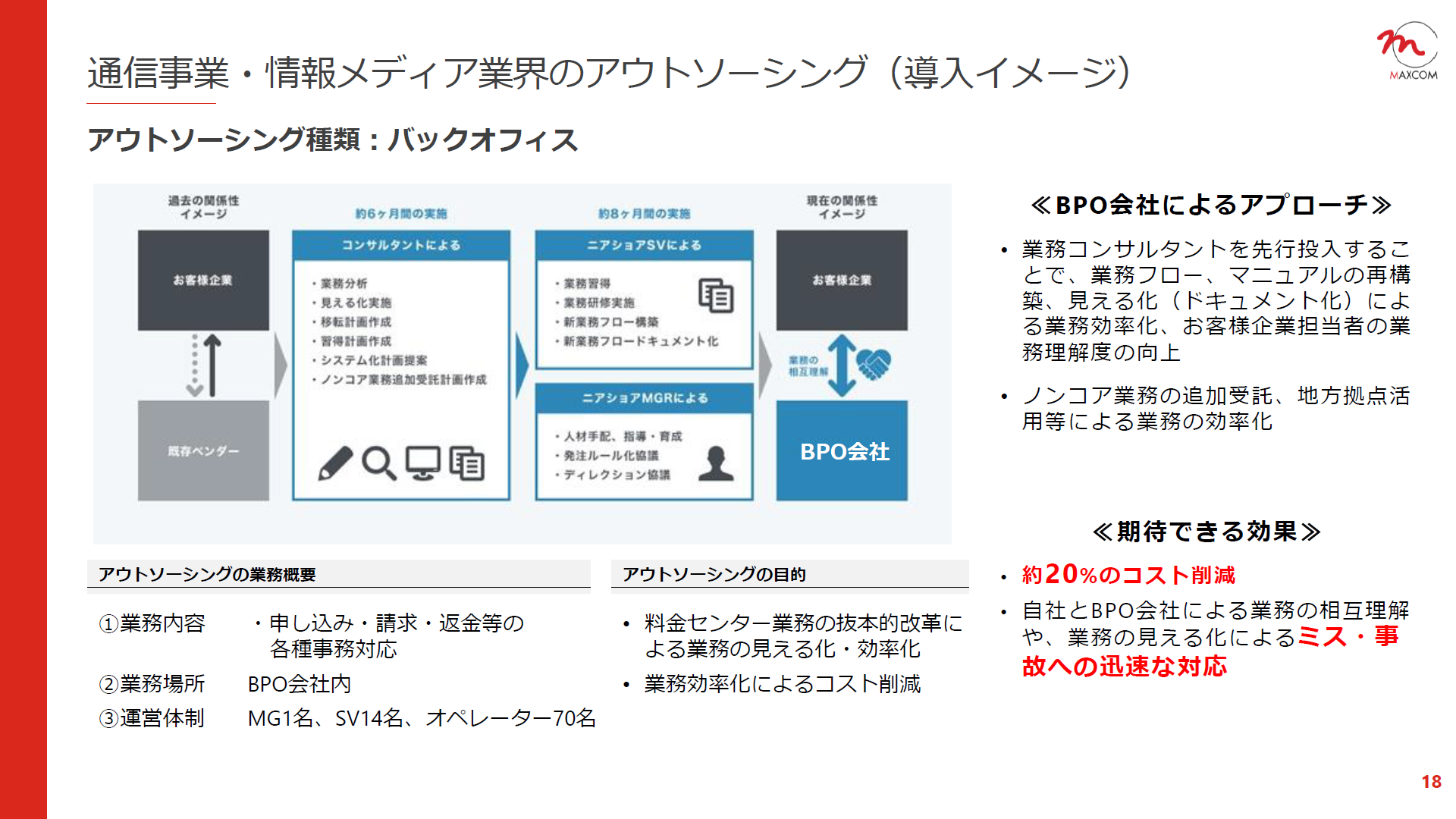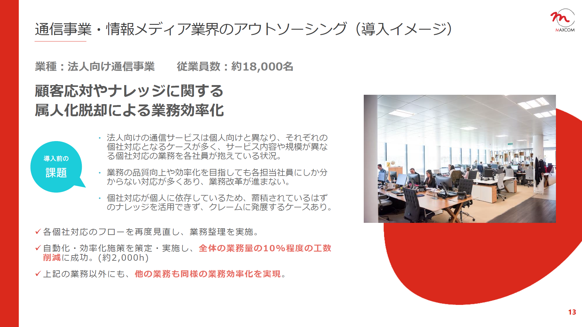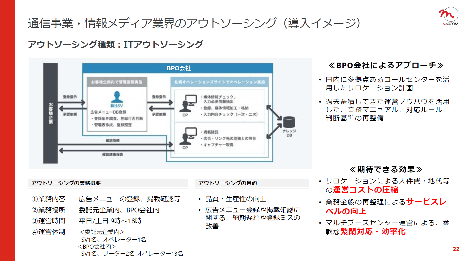 「通信事業・情報メディア業界」ではどのようにアウトソーシングを活用しているか事例やケーススタディをもって紹介する資料になっております。